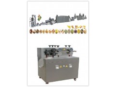 This process line adopts advanced extruding technique which can extrude two kinds of products with different textures and tastes out of double-screw extruder at the same time. It can produce a variety of core-filling food which is popular in the market, such as core-filling rolls, crispy stick, etc. By changing moulds and assistant equipments, it can also produce nutritional powder, grain gruel and many other leisure snacks in different shapes. This automatic process line is of leading level for its superior characters, such as, "applied to many materials, convenient operation and maintenance, low power consumption, high output".