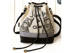 ITEM NO: BLM-160250Material: canvas Gender: Women Style: bucket bagSize is 22cm(L)*31cm(H)*13cm(W)There is sightless zipper pouch & 2 opening pockets inside I pad &A4 is availableWith string opening,Website:http://www.gzbolamay.com, lovely cat print, the bucket is attractive.It is good for outing &shopping.