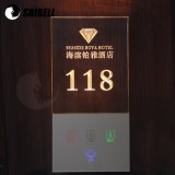 Shenzhen Shibell Technologies Limited is one of the best crystal electronic doorplate manufacturers and suppliers,Website:http://www.shibellswitch.com, welcome to import customized crystal electronic doorplate in stock from our factory.Quick DetailsPlace of Origin:Guangdong,China(Mainland)Brand Name:OEMModel Number:MP201Item Name:Hotel electronic doorplateUsage:Touch panelType:Touch screenColor:More colorsFeather:The thickness of 3.0mm toughened glass panelWorking voltage:AC220VInstallation:86 cassette embedded modeDesign:Zinc alloy package edge,suitable for wood veneer installationMaterials:Zinc alloy +Toughened glassSize:208mm*128mm*10mmPackaging & DeliveryPackaging Details:1pc/white box,50pcs/cartonDelivery Detail:7-15daysShibellGlass Hotel electronic doorplate with Led room number Don't disturb CleanHigh qulityFaster shippingOEM/ODMModelNo.MP201WorkingvoltageAC220V 50HZ(Can be customized elv electronic addresses)ColorDiamondBlack,Crystalwhite,oceanBlue,rosegold,champagnegold,coffeeBottomCasematerialfire-proofingABSMaterialsTemperedglass+ metal wrappedEnergy savingLow standby power consumption,energy conservation and environmental protectionWorkingtemperature-15to50°CServicelifespan:upto1,000,000touchtimesConnection modeThe zero line,the line of fireFunction1.Cable numerical control technology,2.the unique code technology,single and double way dimmerTouch the principlePrinciple of capacitive touch phone,hand touch can reach more than 100000 timesInstallationInternational 86 bottom box embedded installationMOQ10PCSDelivery15days1.Panel is adopted with microcrystalline tempered glass,crystal clear.2.TP LENS in unique design of dark backlit touch,guests can touch screen under any light;simple and elegant exterior design in Western European style,as the first choice of star hotels,guesthouses.3.Under exclusive design,doorbell will never sound when“DND”light is open to lift guests’troubles, offer guests more personal space and improve service quality.4.LED backlit touch resulting in room state control,obvious light indication,conducive to identification at night,in line with modern trends.5.Built-in overload protection,in stable and reliable performance,programmable and controllable computer chip,six-in-one touch screen electronic doorplate intelligent interlock instructions for“room number”,“hotel name”,“DND”,“Please wait”,“clean room”,“doorbell”,very personalized,for easy indoor and outdoor communication.6.Applicable to hotels, guesthouses,apartments,conference rooms,etc,with comfortable and unique intelligent sound and signal prompt,increasing modern charms for the rooms,and effectively improving room re-visit rate.7.Hotel electronic doorplate,room number plate of star hotel,three-in-one hotel doorplate,room status signpost, hotel outdoor information displays, electronic doorplate,touch-screen electronic doorplate,six-in-one electronic doorplate,five-in-one electronic doorplate,four-in-one electronic doorplate,three-in-one electronic doorplate.Standard &CertificationThe product is based on the International requirements GB16915.2-2003 to design and production,and its performance indicators are all in line with CE,FCC certification.Technical ParametersOperating voltage:12V DC or 50/60Hz 80-260VACScrew fixed center distance:50mm(application of 86 bottom case)Service Life:press touch-screen button 1 million times,relay contacts 100,000 times.Power consumption:less than 1W Transport,Packaging & Shipping1,1pc/white box2,50pcs/carton3,Carton size:31.5*31.5*20cmRelated ProductsOur ServicesOEM/ODMYes,it's available. For details, please kindly contact the sales persons.DeliveryThe delivery time is normally 7-15 days after payment.PaymentT/T,Western unio,Escrow,Paypal,L/C.Please do only pay to the official account authorized by Shishell.ShippingDHL,FedEx,UPS,EMS,By Sea,By Air..Warranty3 years warranty