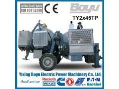 Yixing Boyu Electric Power Machinery Co.,Ltd is one of the best ty2x45tp hydraulic puller tensioner machine manufacturers equipped with professional Boyu ty2x45tp hydraulic puller tensioner machine factory.Quick DetailsPlace of Origin: Jiangsu,Website:http://www.boyu-stringingequipment.com, China (Mainland), Jiangsu, China (Mainland)Brand Name: BOYU BRANDModel Number: TY2x45TPType: Hydraulic PullersOEM Service offered: ISO9001Packaging & DeliveryPackaging Details:According to the customers' request...Delivery Detail:within 30 days1.Main parts German Rexroth Wika1.Main parts German Rexroth Wika2.Max tension 2X45kN3.Engine Cummins4.Twin-bundle conductorTY2X45TP Hydraulic puller tensioner machineThe machine is suitable to string one or two ropes or bundled conductors on bull-wheels with two pair of bull-wheels with completely independent controls. The bull-wheel grooves are made of wear-proof interchangeable nylon sectors. The machine is completely electronically controlled.Performance parameterPullerMax pull: 2x45kN/1x90kNSpeed at max pull: 2.4km/hMax speed: 5km/hPull at max speed: 2x22kN/1x44kNTensionerMax tension: 2x45kN/1x90kNMax speed: 5km/hCharacteristicsBull-wheel diameter: 1500mmMax rope diameter : 18mmMax conductor diameter: 40mmTotal weight: 6200kgOverall dimension (length*width*height): 4700×2300×2700mmEngineDiesel 118kw(158hp)Cooling system waterElectrical system 24VMain configurationEngine: Cumminshydraulic pump: German RexrothMain motor: German Rexrothspeed reducer: German RexrothHydraulic meter: German WIKAConfiguration2 negative self-acting hydraulic brakes2 hydraulic dynamometers with set-point and automatic control of maximum pullHydraulic oil cooling system2 digital meter countersControl instruments for hydraulic system and diesel engineRigid axles for towing at max speed of 30km/h with mechanical parking brakeHydraulic power pack to control 2 reel stands with hydraulic head or 2 reel winders with independent controlsHydraulic front stabilizerGrounding connection pointHydraulic Transmission2 closed hydraulic circuit allows step less speed variation in both rotating directions. This machine is provided with a pull pro-setting system that maintains the pre-set pulling value (also when the speed is reduced to "0") by automatically adjusting the operation speed according to the friction and unexpected loads which may occur.More pictures: Production workshop