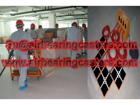 We have five kinds air bearing rigging system: 10 Tons capacity air bearing caster, 16 tons capacity air power moving dollies, 20 tons air bearing moving system, 32 tons air rigging system. 48 tons air skates.