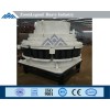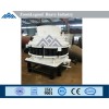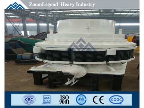 It's mainly comprised of frame, eccentric sleeve, bow-shaped cover, main bearing, pushing cylinder, feeding hopper, distribution tray, rolling mortar wall, adjusting device, release cylinder and gear wheel and pinion. The adjustment and the assurance is achieved by the hydraulic cylinder and oil cylinder system supported at the bottom of the main bearing of the moving cone. Adding or reducing the high pressure oil in the hydraulic cylinder can lift or lower the main bearing and the crushing cone to adjust the discharging outlet, while the overload protection is achieved by accumulator filled with noble gases.