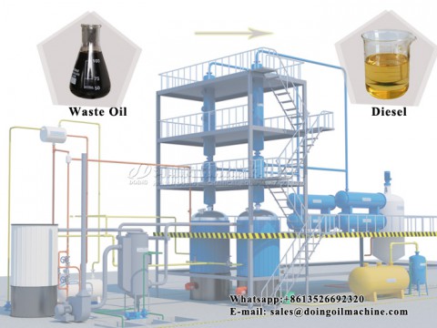 Waste oil distillation plant can refine waste oil into diesel, which is a better fuel oil and has a better market value. It mainly consists of control cabinet, heat transfer oil system, vertical reactor, vertical and horizontal condensers, oil tanks, water seal device, decolorization & deodorization tower, etc. Recently, Doing Group has developed an advanced waste oil distillation plant with a high oil yield of about 90%.