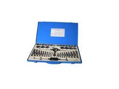 Heavy Duty, Heat Treated Alloy Steel Construction, Rust Resistant, Satin Finish, Precision Ground and Polished Surfaces Facilitate Chip Removal, Rockwell Hardness of 58-61 HRC, 2-pc. Tap Wrenches: 1/8" to 1/2" and 1/4" to 1", 2-pc. 2"-Diameter Die Stock with 1-1/2" Adapter, 1-pc. 1/8" Mini Flat Screwdriver, 20-pc. Taps, 20-pc. Split Dies, Complete with Iron box